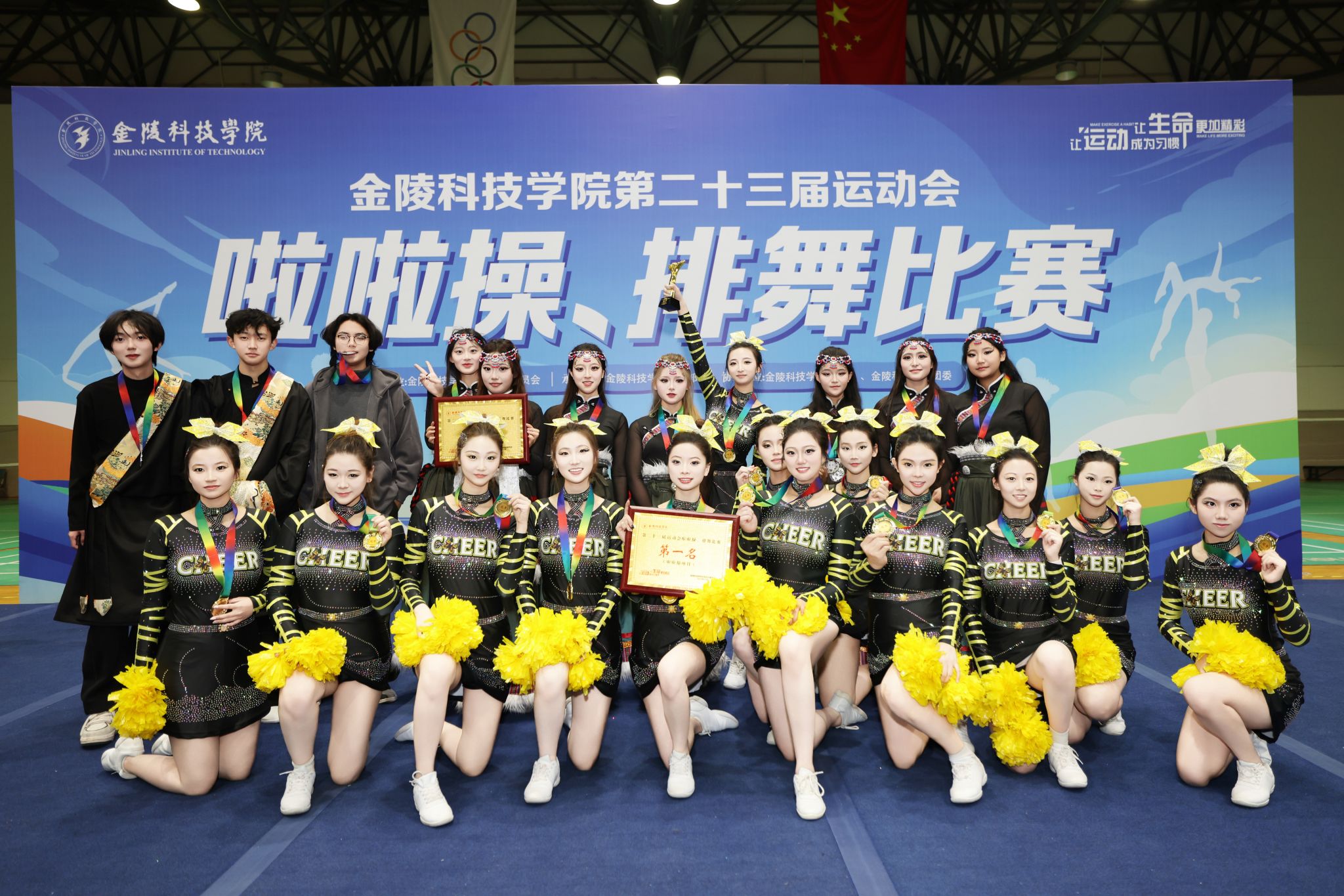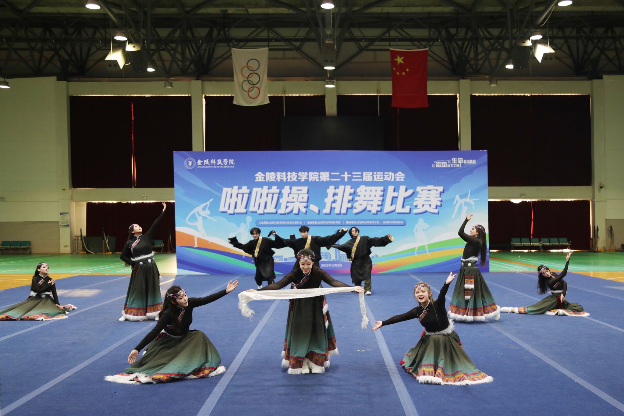 优异成绩的背后,是队员们日复一日的坚持与团队同心协力的付出。啦啦操队以数百次的重复训练诠释“团结是胜利的基石”。排舞队则通过民族元素的创新融合展现文化自信。此次获奖不仅是人文学院体育文化建设的丰硕成果,更是学院学子积极向上、团结拼搏精神风貌的生动体现,凝聚着深厚的团队情谊与民族共融的美好愿景。