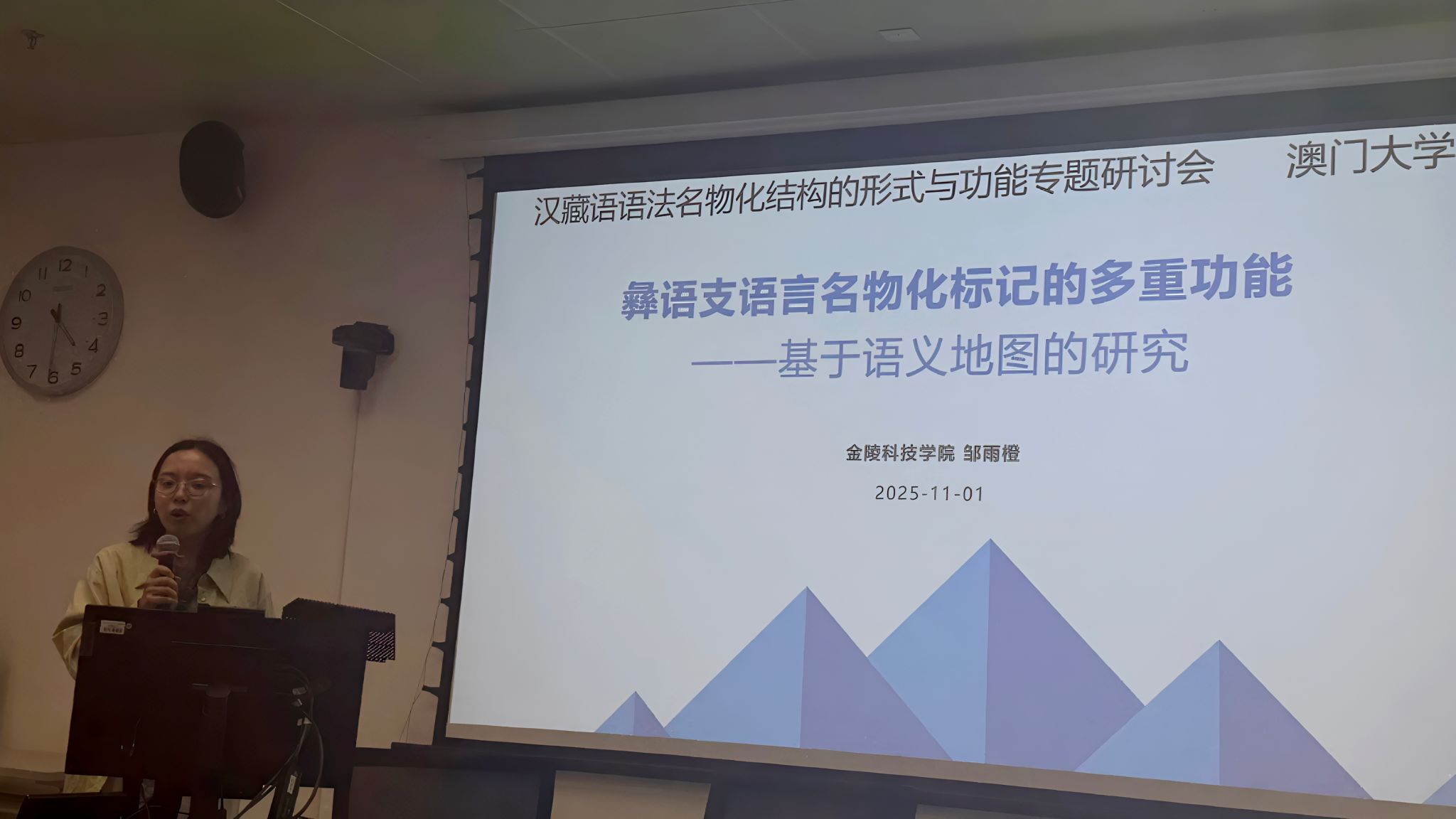 11月1日至2日,由澳门大学人文学院中国语言文学系主办的“汉藏语语法名物化结构的形式与功能专题研讨会”在澳门大学顺利召开。我院青年教师邹雨橙博士受邀参会,以“彝语支语言名物化标记多重功能及语法化路径”为题作特邀学术报告,充分展现了我院青年教师的学术风采。