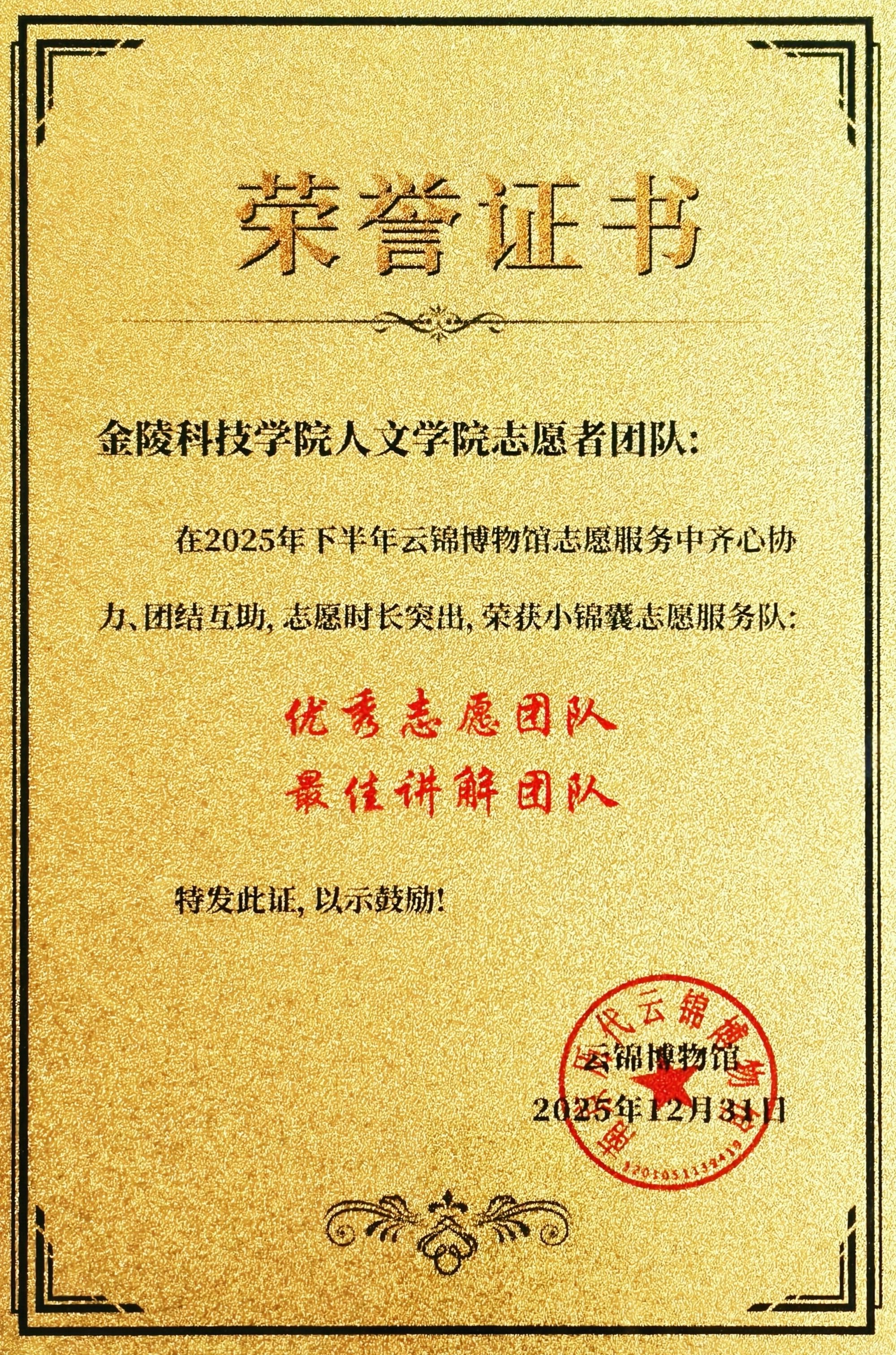 近日,人文学院“文博新声”志愿服务团队凭借在南京历代云锦博物馆扎实的工作与创新的实践,荣获该馆颁发的“优秀志愿团队”“最佳讲解团队”荣誉称号,达成志愿服务荣誉“三连冠”。