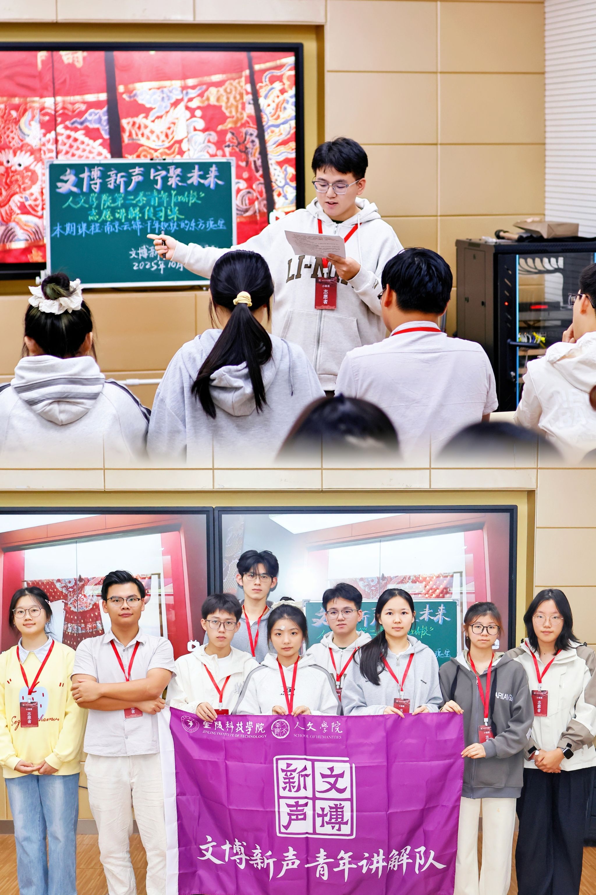 2025年全年,志愿队共组织138名志愿者上岗服务,累计服务时长达1700小时。为确保服务质量并实现团队的可持续发展,队伍坚持每学期常态化招新,系统开展多次线下培训,并重点加强了讲解员队伍的建设,创新性地开展了“薪火夜研·人文学院青年Yeah校”志愿讲解传习课程,内容涵盖《南京云锦历史与文化》《南京云锦技艺与美学》等专业知识。在讲解内容打磨上,古典文献学、汉语国际教育等专业学生充分发挥学科优势,依托《江苏手工艺史》《江苏丝绸史》等学术专著对讲解词进行梳理、考证与优化升级,让每一段讲解既保有厚重的历史质感,又具备鲜活的传播张力。
